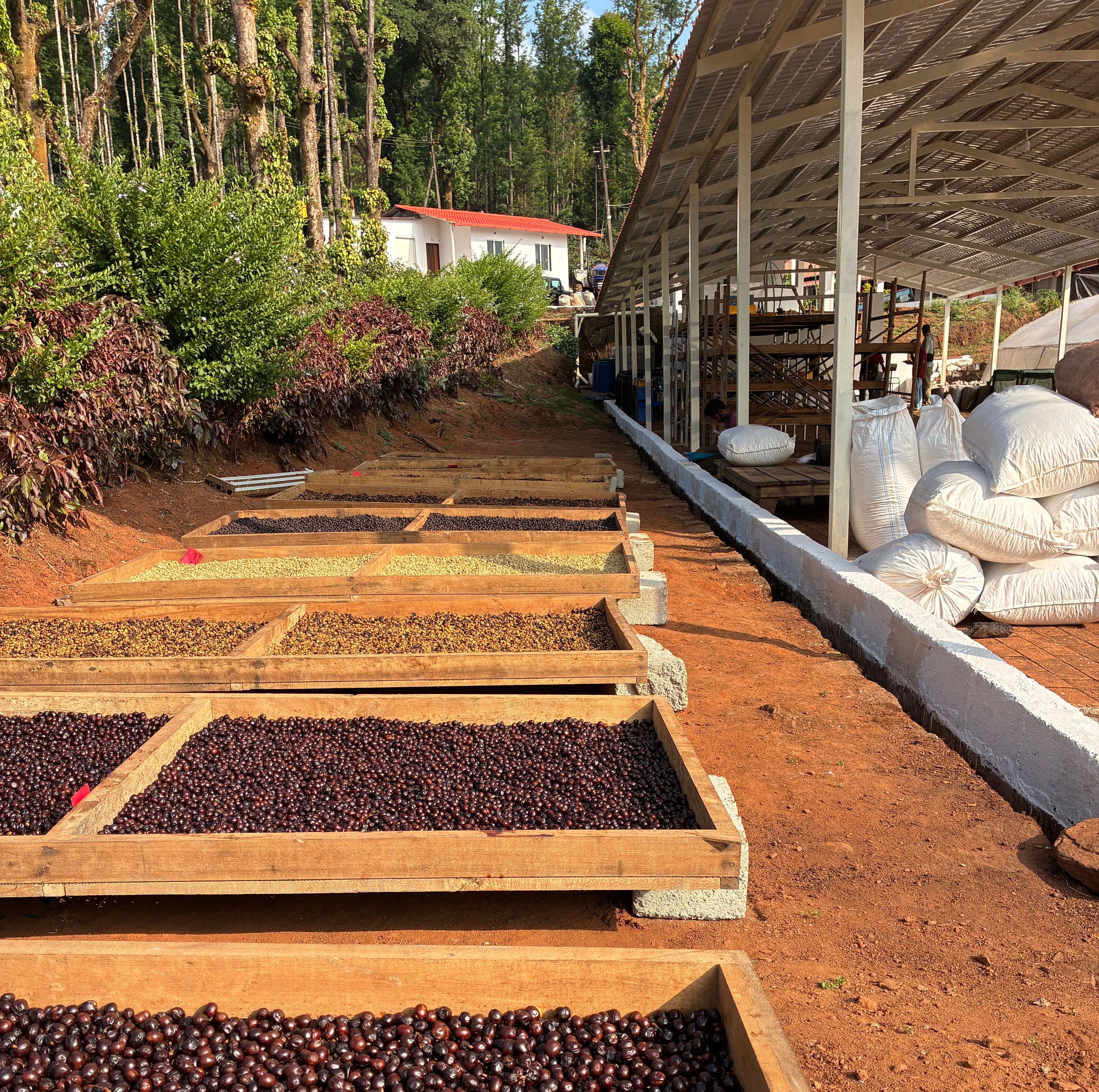 Natural, honey, and washed process lots, drying at Gundikhan Estate in Chikmagalur, India.